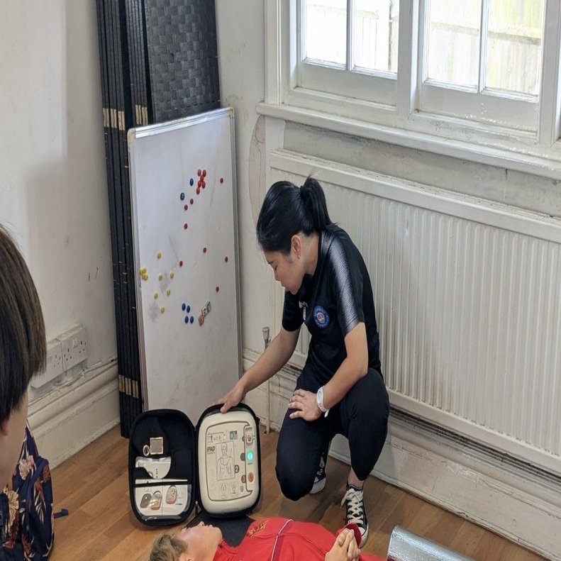 さらに、同僚のコーチたちに向けて、緊急時の応急処置やAEDの使用方法の講習も行いました。